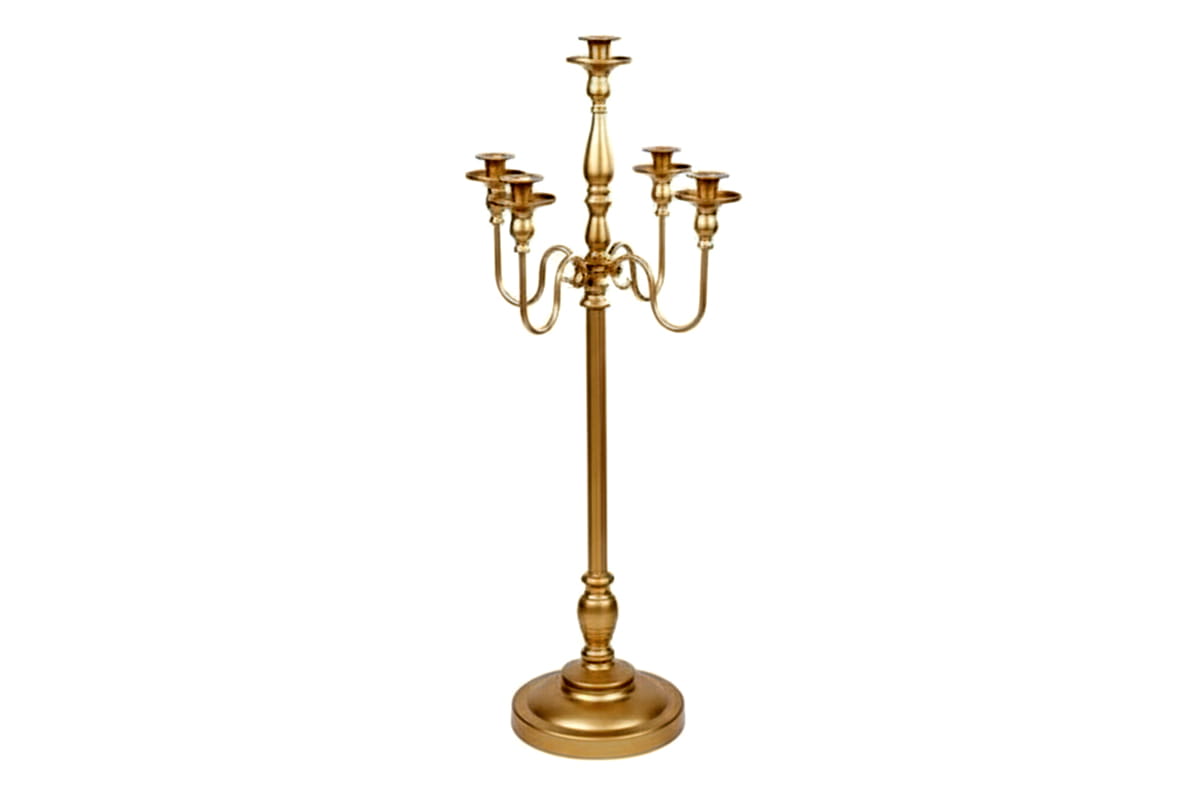 Apportez une touche de grandeur sophistiquée à votre événement avec ce chandelier en métal doré satiné aux reflets subtils et luxueux. Sa structure élancée culmine à 154 cm de hauteur pour un diamètre de base de 54 cm. Et offre une présence verticale spectaculaire sans alourdir l’espace. Les 5 branches courbes et équilibrées se terminent par des porte-bougies classiques. Prêts à accueillir une variété de bougies pour une lumière douce et chaleureuse.