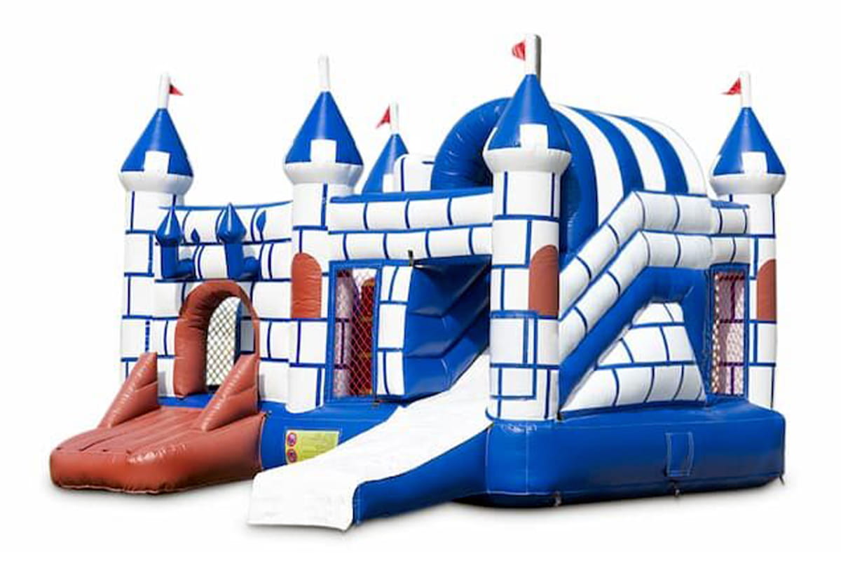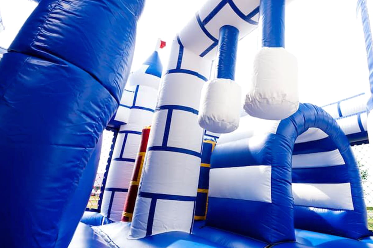Le château gonflable Château Fort est imposant et majestueux. Il reproduit un vrai château fort. Des tours crénelées aux toits bleus pointus dominent l’ensemble. Les remparts sont solides en pierre blanche et bleue. Un pont-levis, des portes fortifiées et des fenêtres ogivales ajoutent du réalisme. Des drapeaux flottent au vent. L’ambiance reste imprenable. Ainsi, les enfants entrent pleinement dans l’univers des chevaliers, des dragons et des grandes batailles !