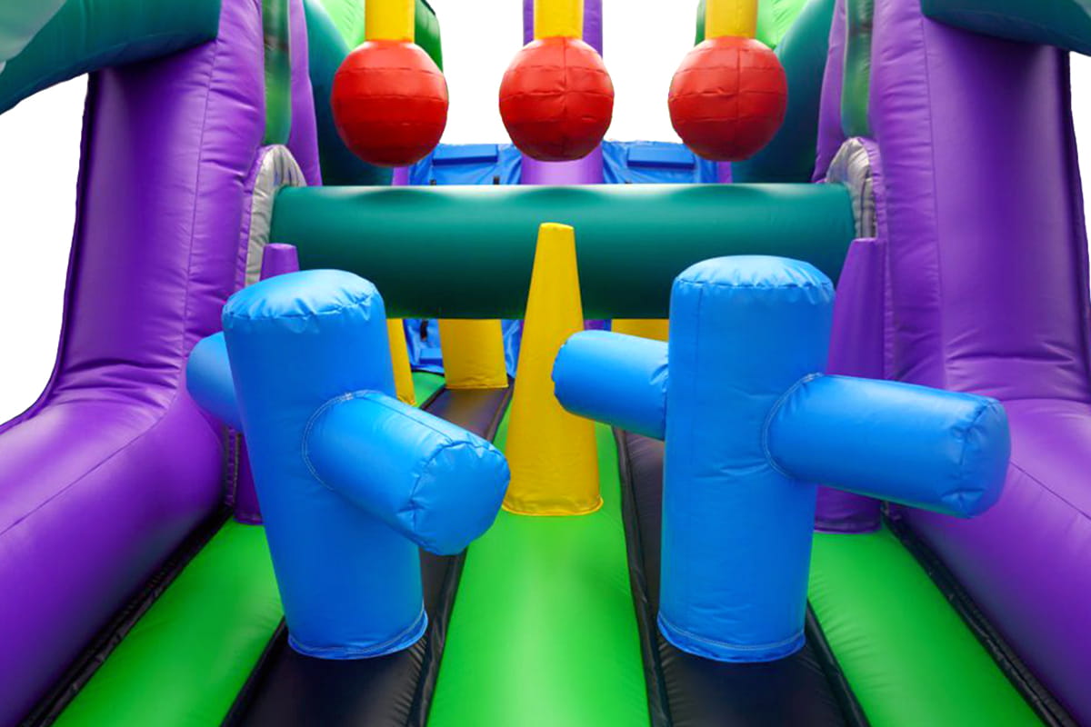Ce format allongé offre un espace généreux et très ludique. Les enfants rebondissent librement, grimpent aux structures, glissent avec délice et explorent tous les recoins de ce terrain de jeu gonflable géant.