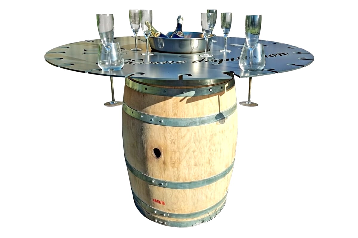 Pièce unique et authentique : tonneau réel recyclé, plateau inox personnalisé, look haut de gamme