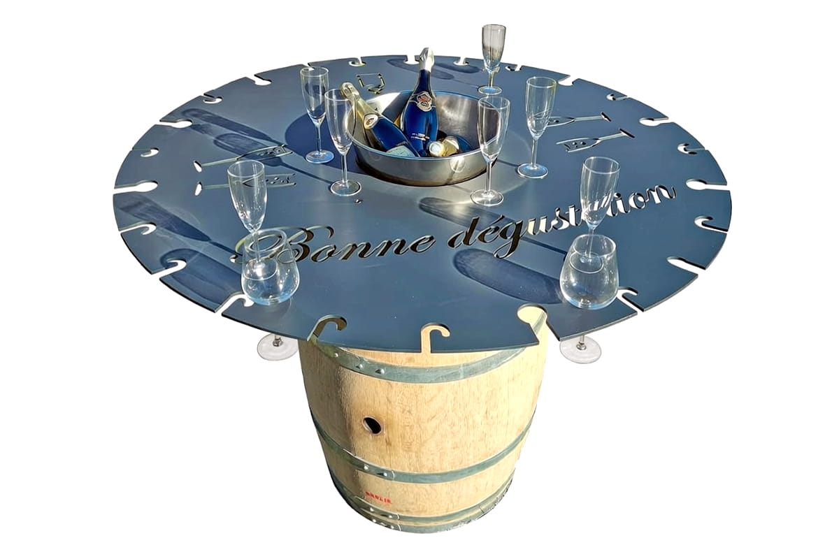 Idéal pour un apéritif chic, une dégustation de vins, un mariage, un anniversaire ou un événement professionnel élégant ! Vous cherchez une pièce maîtresse originale et conviviale ? Ce mange debout en tonneau est parfait pour créer un espace festif, raffiné et totalement photogénique. Fabriqué et conçu en Bourgogne, ce tonneau authentique est surmonté d’un plateau circulaire en métal découpé laser avec emplacements pour verres et seau à champagne central. Le design intègre des motifs de verres à vin et l’inscription « Bonne dégustation » en élégante calligraphie. Le tonneau peut accueillir jusqu’à 12 personnes debout, offrant un format généreux pour des échanges conviviaux autour d’un bon verre.