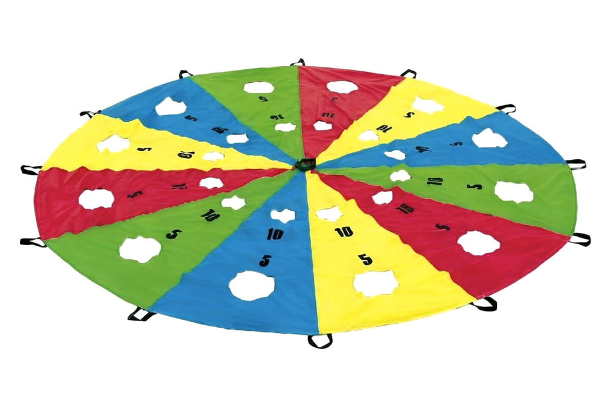Ce grand parachute multicolore (bleu, vert, rouge, jaune) mesure plusieurs mètres de diamètre. Il présente des trous numérotés de 5 à 20 points et des zones ouvertes. Des poignées solides tout autour permettent à 10, 20 ou même 30 enfants et adultes de le tenir ensemble. Une balle légère vient se poser au centre. Le visuel éclatant et joyeux attire immédiatement les foules. Ajoutez le Parapoints à votre événement. Vous créerez des vagues synchronisées, des chutes hilarantes et des victoires collectives célébrées dans la joie. Un incontournable pour dynamiser votre kermesse !