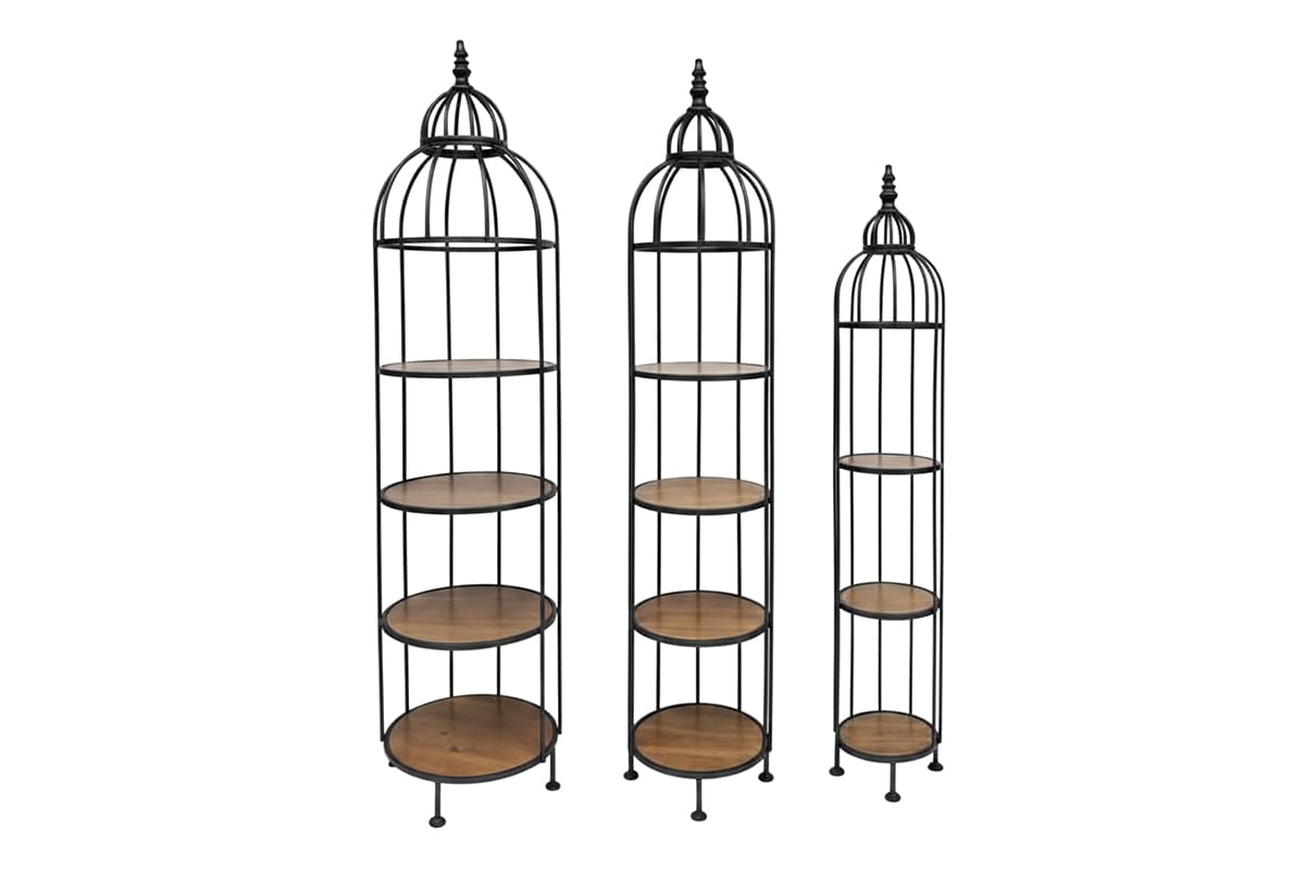 Ajoutez une touche sophistiquée et originale à votre décoration avec nos Tourelles vintage en métal noir forgé et plateaux en bois naturel. Ces présentoirs sculpturaux, inspirés des cages d’oiseaux d’antan, se déclinent en trois tailles harmonieuses : 45 cm de diamètre × 190 cm de hauteur, 36 cm × 186 cm et 27 cm × 156 cm. Leur silhouette élancée et leur finition mate noire contrastent élégamment avec le bois chaleureux des plateaux circulaires.