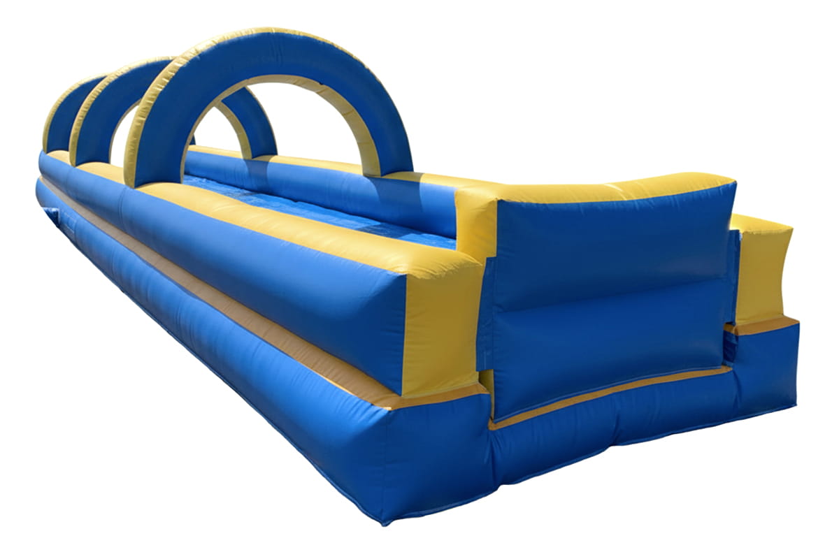 Ce modèle mesure 13,50 m de longueur, 3 m de largeur et 2,80 m de hauteur, avec des arches gonflables qui ajoutent du style et de la hauteur. Il accueille 2 personnes en simultané (2 par 2 sur les pistes parallèles), pour des courses amicales endiablées ! Adapté dès 3 ans jusqu’à 77 ans, il convient à toute la famille. La structure gonflable respecte les normes de sécurité, avec des bords amortissants et un bassin de réception inclus pour finir en douceur. Une arrivée d’eau continue assure une glisse fluide et rafraîchissante.